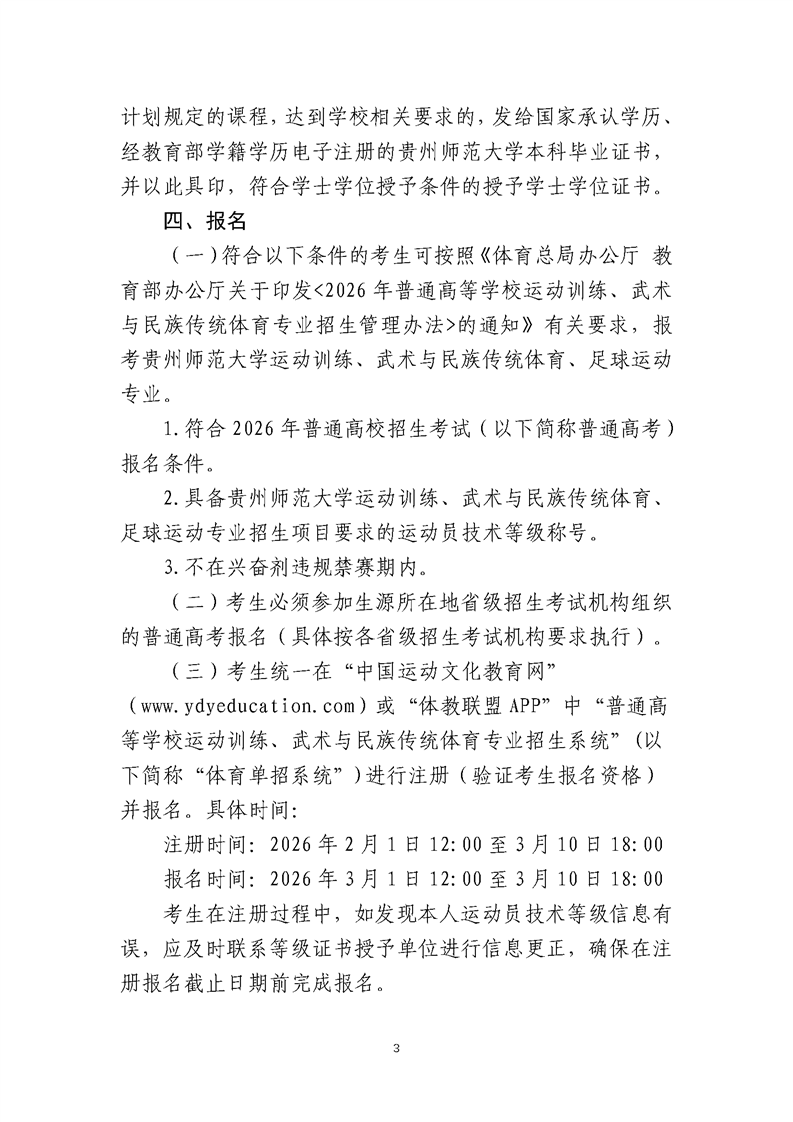 贵州师范大学2026年运动训练、武术与民族传统体育、足球运动专业招生简章